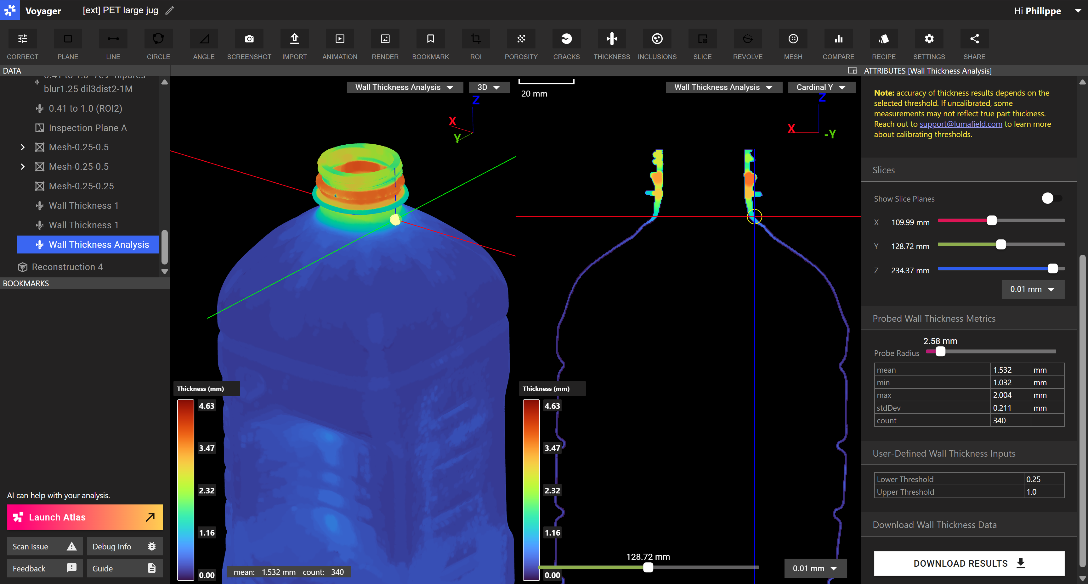 薄肉の医療部品、消費財パッケージ、AM 部品、鋳造など、内外両面の肉厚を評価できます。結果は Voyager 上でヒートマップ表示でき、特定箇所の統計を確認したり、メッシュ/CSV として書き出せます。類似部品の大量検査にはレシピによる自動化も可能です。