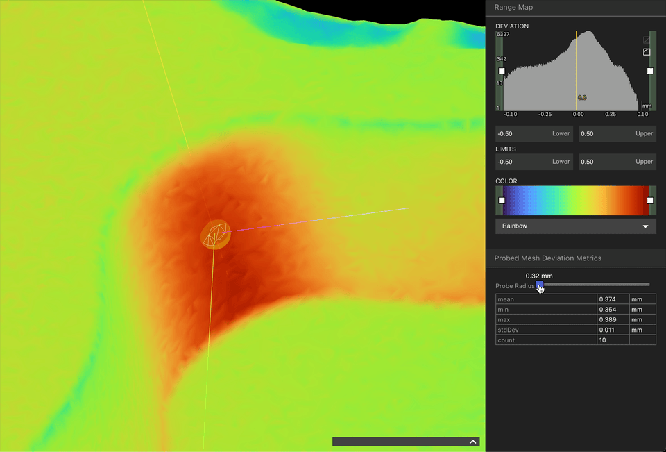 偏差は解析メッシュ上にヒートマップで表示。赤は正偏差 (外側へ)、青は負偏差 (内側へ)。プローブツール