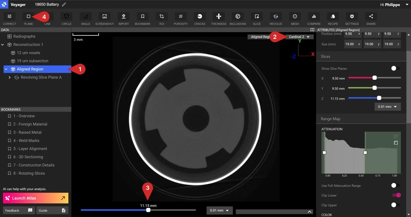 - ビューポート下部のスライダーや、オブジェクトの Attributes で、検査したいスライス位置を選びます。