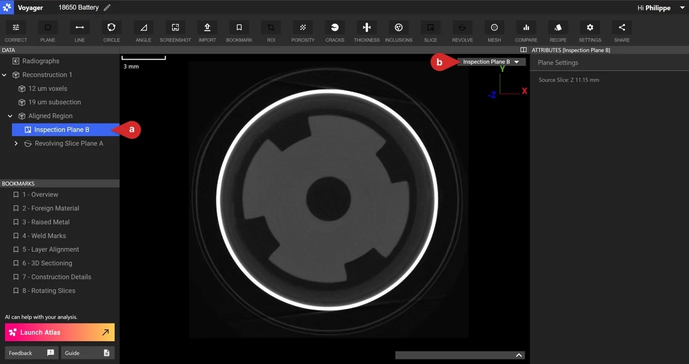 - まだ選択していない場合は、インスペクションプレーンをクリックしてメインビューに表示