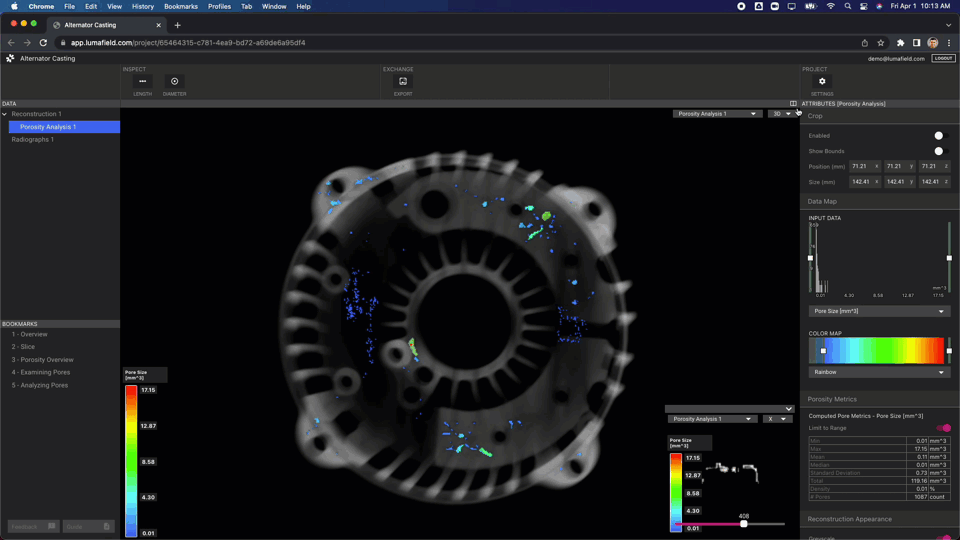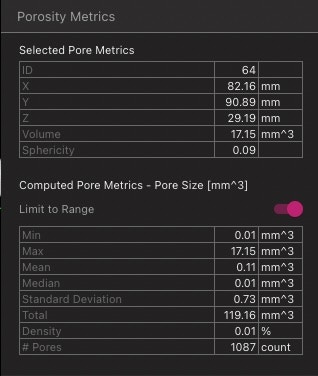 - 任意の空隙クリックで、そのサイズ/形状/位置の “Selected Pore Metrics” を表示