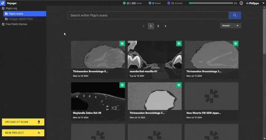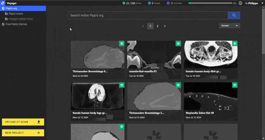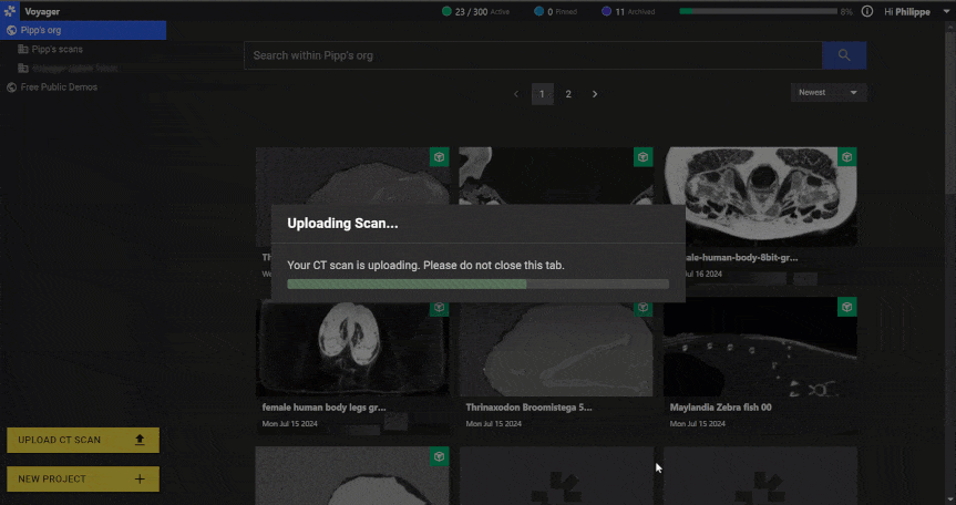 - Voyager のプロジェクトダッシュボード左下の “Upload CT Scan” をクリック