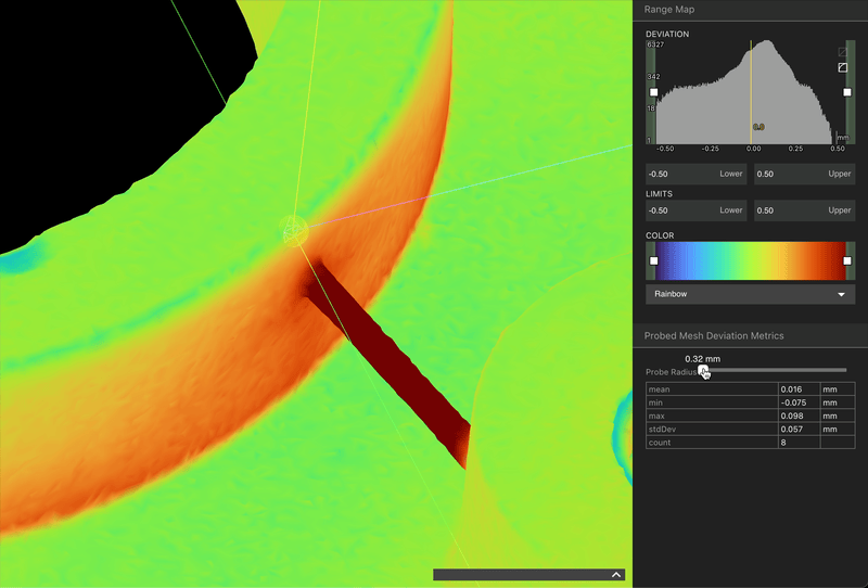 Clicking anywhere on a comparative analysis result will activate the probe tool, allowing you directly measure the deviation at that location. The mean deviation and the number of polygons being sampled by the probe are displayed in the lower left hand corner, near the color bar.