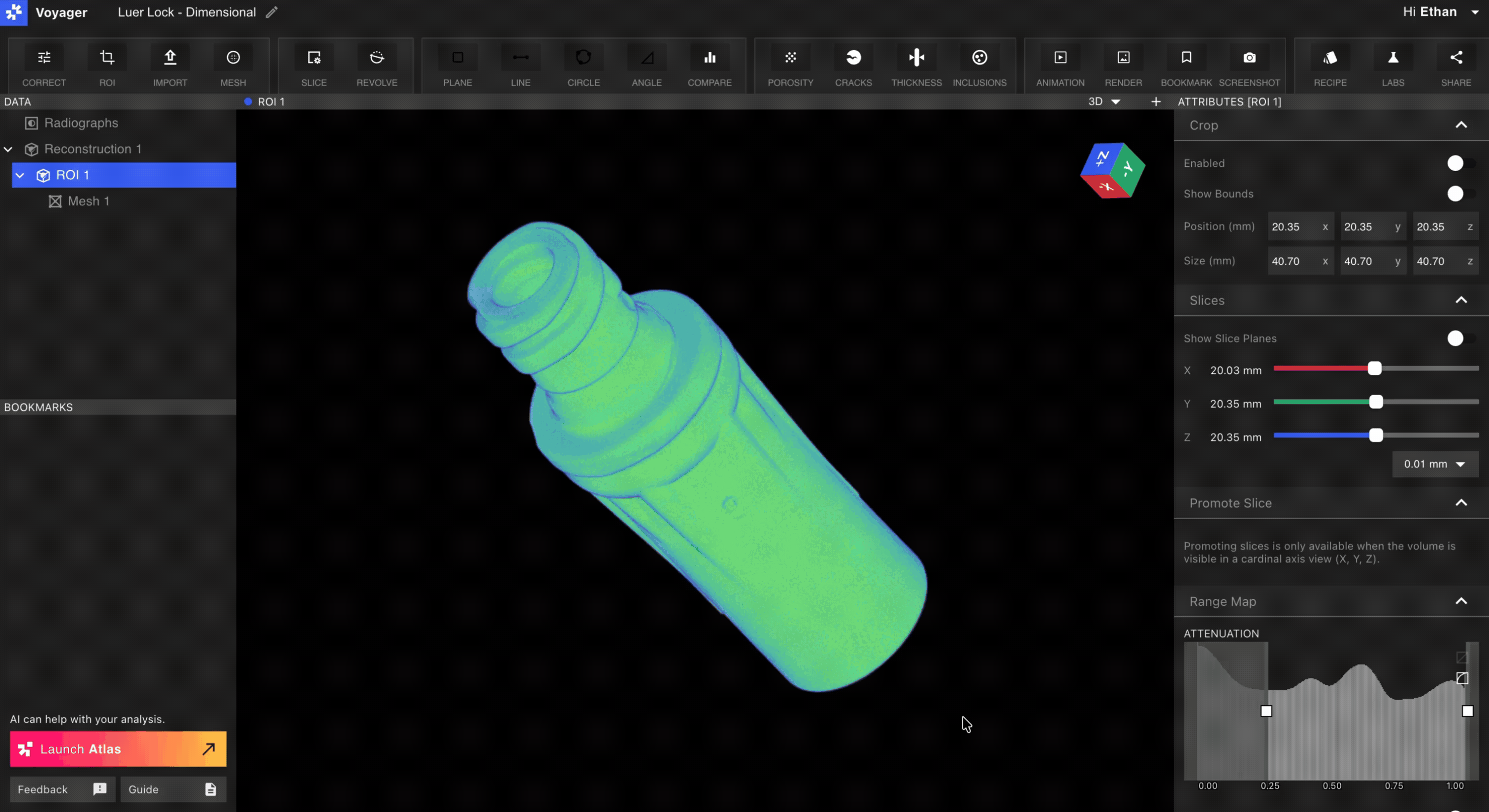 The ISO-50 method of boundary selection is accurate for scans of low attenuation mono-material parts. Some examples include injection molded single-plastic parts, 3D printed single material parts, and parts made of fiberglass or other relatively low attenuation material. The method works by identifying the two primary attenuation values in the volume (in an ideal part, these voxels are clustered around the part material and the air in the scan), and then finding the exact 50% midpoint between them. That midpoint is a statistically accurate part boundary. By generating a Mesh from the volume at that threshold, you are extracting an accurate part boundary with which to perform subsequent analyses such as dimensioning and surface comparison.Workflow