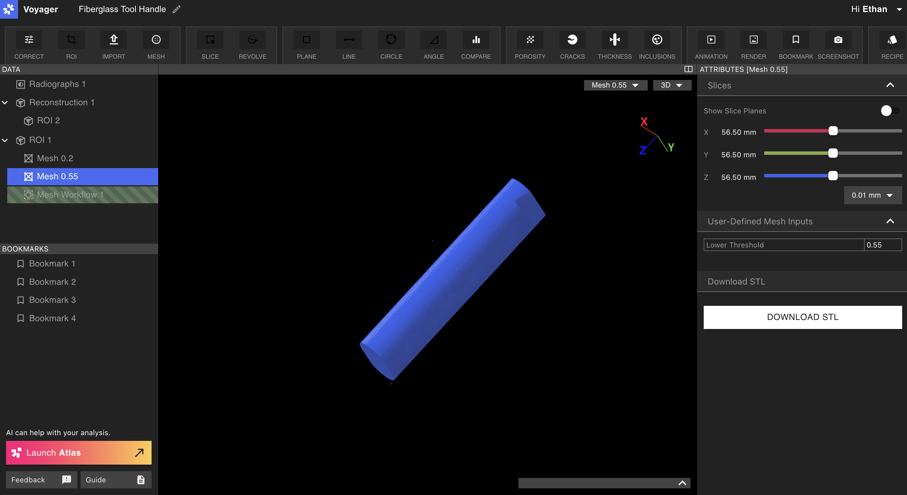 This tool handle is made up of a plastic overmolded to a fiberglass core. Note the material spikes in the range map, and the threshold to provide separation.Select the desired data object from the Data Panel, and select the Mesh Tool.