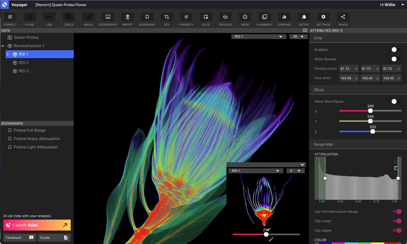 The ROI tool allows you to choose a spatial region of interest of your part that you wish to see in high resolution. In a similar way, the rangemapper along with the renormalization tool allows you to choose a region of attenuation that is most interesting to you.